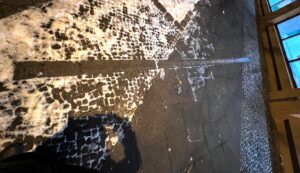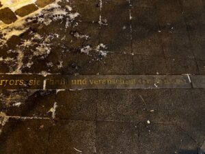 Viel zu früh kam ich an. Googlemaps hatte dreiunddreißig Gehminuten errechnet, ich brauchte nur zwanzig und zwei, hatte also Zeit und guckte mir extrem schlechte Kunst durch die Schaufenster zweier benachbarter Galerien an und blieb dann vor einer der Bronzeleisten stehen, die auf dem Rosa-Luxemburg-Platz weit sternstrahlartig ins Trottoir eingelassen sind. Sie sei allen „Hamasverstehern“ ins Poesiealbum gestanzt, vor allem den „linken“, weil deren Herz für so etwas vielleicht doch noch etwas Platz hat; das der Rechten ist ein, wie ihr eigentlicher, Schrumpfkopf: