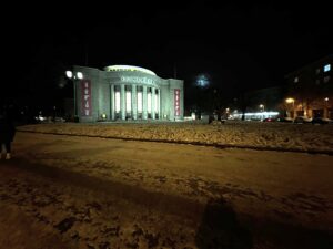 Nun jedenfalls konnte ich mich beruhigt auf den Weg zur Volksbühne begeben, was ich spazierengehend tat. Zu märchenhaft die verschneiten, teils vereisten Straßen den Prenzlauer Berg hindurch und hinab; selbst das Dunkel des Abends war vor Gefunkel geradezu hell, und vom schimmernden Glanze des Schnees. Ich schrieb’s ja schon, daß mir die Kälte derzeit gefalle.