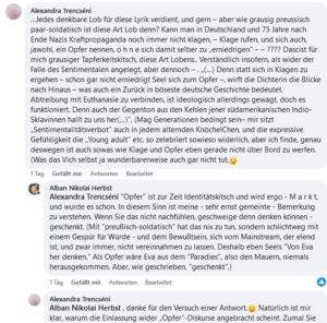 eine kleine → Auseinandersetzung bei Facebook; sie beschäftigt mich nach wie vor sehr. Typische Bewegung übrigens, meines psychischen Verarbeitungsapparates. Anfangs war ich über die Attacke verärgert, dann begann ich, mich zu öffnen, einfach, weil das Thema objektiv brennt. Auch aber, weil der Ton nicht ganz so mehr aggressiv war. Freundin, entscheiden Sie selber.