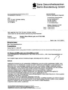 Mal davon abgesehen, daß es schon irritiert, wenn immer noch per Post geschickt wird, was sich elektronisch in Sekundenbruchteilen zum Empfänger bringen läßt — vor allem direkt vor Feiertagen, von denen bekannt ist, daß sie zu Urlauben, Praxisferien führen, die noch über die gleich danach folgenden Feiertage nict selten sogar weit hinauslangen … — davon abgesehen also, daß der Befund einer CT, die am 17. Dezember durchgeführt wurde, dem Patienten erst nach dem 5. Januar zur Kenntnis gebracht werden kann, —