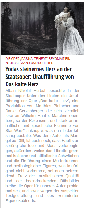 Hauptseite / Oper Neu bei Faustkultur: Mit Yodas steinernem Kitschherz unter den Linden. Dort an der Staatsoper die Uraufführung von Matthias Pintschers und Daniel Gerzenbergs Oper „Das kalte Herz“ – vorgeschützt nach Wilhelm Hauff. - 13. Januar 2026 | 13. Januar 2026 - Alban Nikolai Herbst 1 minute read → D o r t :