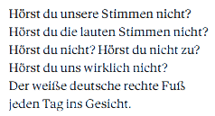 Doch wenn ich das Programmheft lese, frage ich mich, in welcher Vergangenheit diese Librettistin denn lebt: „Vielleicht ist das Leben von migrantisch gelesenen“ – gelesenen! – der Mensch ist ein …. – Text???? – „… migrantisch gelesenen Personen irgendwann weniger von harter, unterbezahlter Arbeit, weniger von Diskriminierung und ständigem „Anderssein“ geprägt? Vielleicht zerfließt irgendwann das zählebige Ideal einer (…) „homogenen, christlichen weißen Gesellschaft, in der Männer das Sagen haben, Frauen sich vor allem ums Kinderkriegen kümmern und andere Lebensrealitäten schlicht nicht vorkommen (…).“